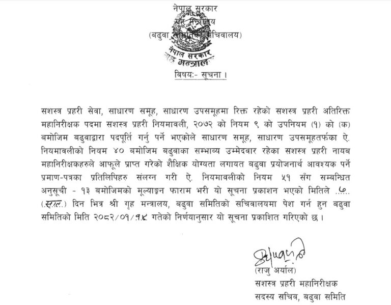 बढुवा समितिको सचिवालयका सदस्य सचिव सशस्त्र प्रहरी महानिरीक्षक राजु अर्यालले आईतबार सूचना प्रकाशित गर्दै बढुवाका लागि सम्भाव्य उम्मेदवारले शैक्षिक योग्यता लगायत बढुवा प्रयोजनार्थ आवश्यक पर्ने प्रमाणपत्रका प्रतिलिपि संलग्न गरी ७ दिनभित्र सचिवालयमा पेश गर्न भनेका छन् ।