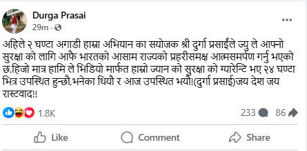 स्टाटसमा लेखिएको छ, ‘अहिले २ घण्टा अगाडि हाम्रा अभियानका संयोजक श्री दुर्गा प्रसाईंज्यूले आफ्नो सुरक्षा को लागि आफैँ भारतको आसाम राज्यको प्रहरीसमक्ष आत्मसमर्पण गर्नुभएको छ, हिजोमात्र हामी ले भिडिओ मार्फत हाम्रो ज्यानको सुरक्षा को ग्यारेन्टी भए २४ घण्टाभित्र उपस्थित हुन्छौं,भनेका थियौं र आज उपस्थित भयौं !(दुर्गा प्रसाईँ) जय देश जय रास्टवाद!!’