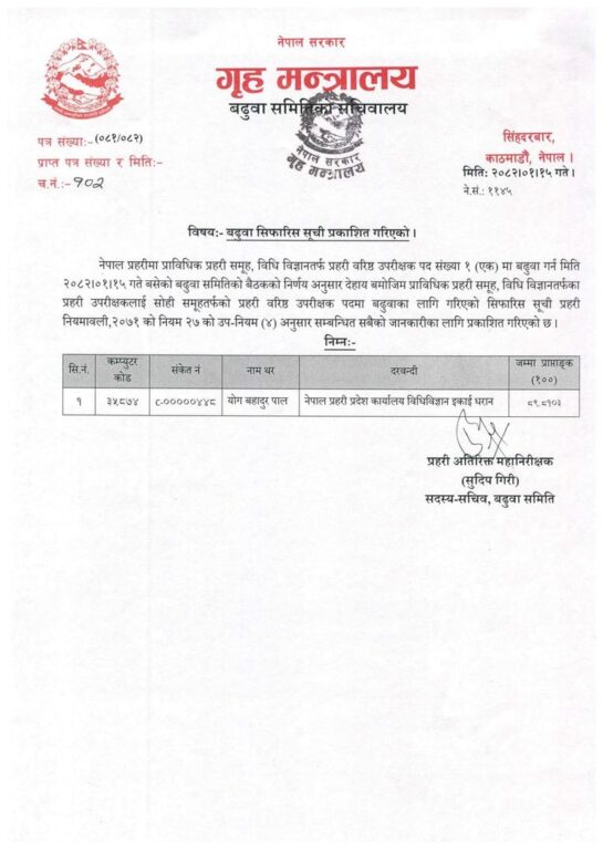 काठमाण्डु – गृह मन्त्रालयको बढुवा समितिले नेपाल प्रहरीको प्राविधिक प्रहरी समूह, विधि विज्ञानतर्फ प्रहरी वरिष्ठ उपरीक्षक (एसएसपी) मा विधि विज्ञान इकाई धरानका योगबहादुर पाललाई बढुवा गरेको छ ।