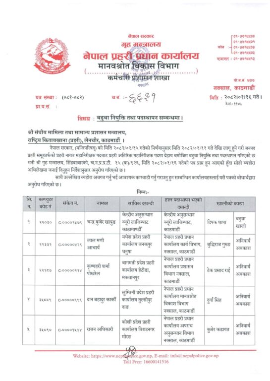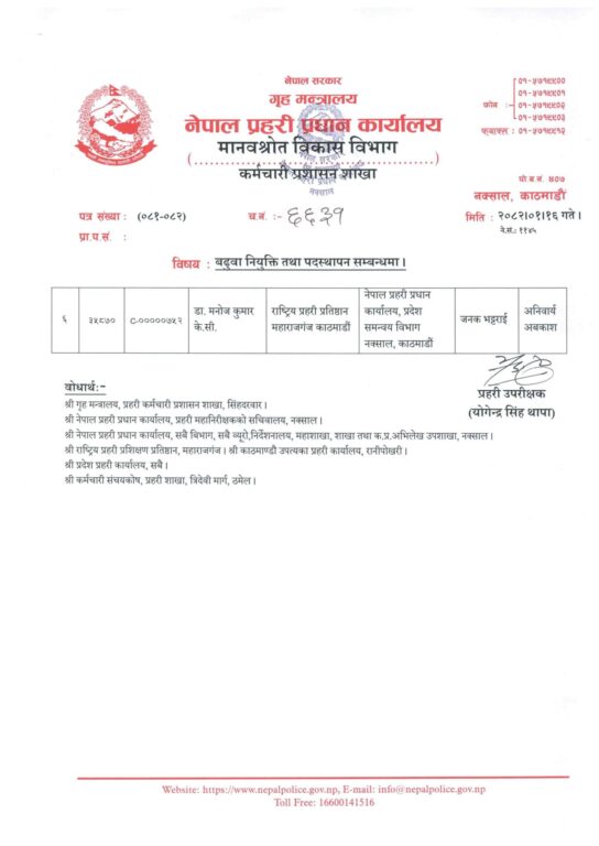 प्रहरी प्रधान कार्यालय कार्य विभागमा लालमणि आचार्य, प्रशासन विभागमा कृष्णहरी शर्मा, मानवस्रोत विकास विभागमा दानबहादुर कार्की, अपराध अनुसन्धान विभागमा राजन अधिकारी र प्रदेश समन्वय विभागमा डा. मनोज कुमार केसीलाई पदस्थापन गरिएको छ ।
