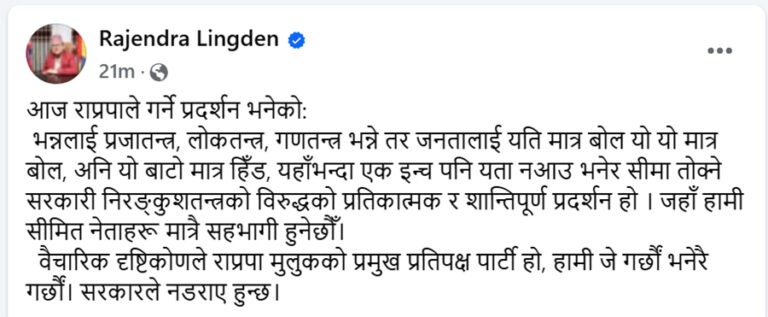 लिङ्दनेले थप लेखेका छा्, ‘हामी जे गर्छौं भनेरै गर्छौं । सरकारले नडराए हुन्छ ।’ राप्रपाले गर्ने प्रदर्शनमा निषेधित क्षेत्र तोड्ने भनिएपछि सुरक्षा व्यस्था चुस्त पारिएको छ ।