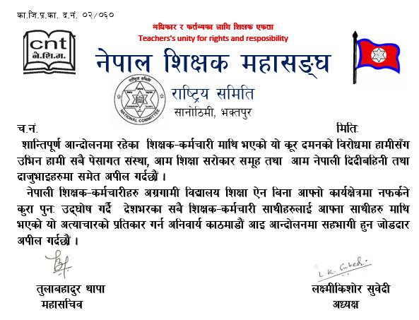 अध्यक्ष लक्ष्मीकिशोर सुवेदीले शान्तिपूर्ण आन्दोलनमा रहेका शिक्षक तथा कर्मचारी माथि भएको क्रूर दमनको विरोधमा उभिन सबै पेसागत संस्था, आम शिक्षा सरोकार समूह तथा आम नेपालीलाई अपिल गरेका छन् ।