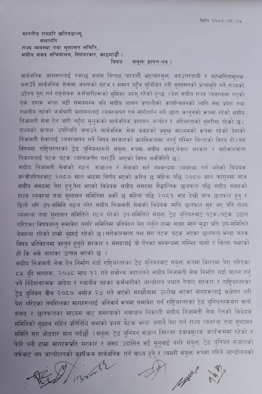राज्य व्यवस्था तथा सुशासन समितिको बैठकमा सङ्घीय निजामती सेवाको गठन, सञ्चालन र सेवाका सर्त सम्बन्धमा व्यवस्था गर्न बनेको विधेयक,२०८० का सम्बन्धमा गठित उपसमितिको प्रतिवेदनमा छलफल हुने भएपछि ज्ञापनपत्र बुझाएका हुन् ।