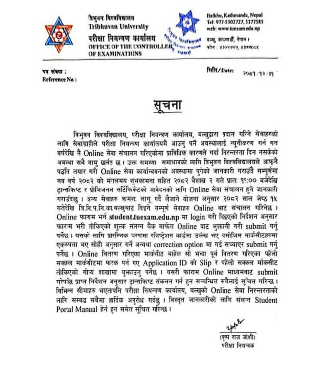 आगामी जेठ १५ गतेदेखि परीक्षा नियन्त्रण कार्यालय बल्खुबाट दिइने सम्पूर्ण सेवा अनलाइनबाट सञ्चालन गरिने पनि जोशीले बताए ।