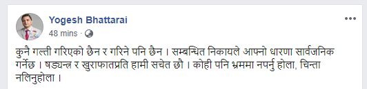 ‘कुनै गल्ती गरिएको छैन र गरिने पनि छैन । सम्बन्धित निकायले आफ्नो धारणा सार्वजनिक गर्नेछ,’ मन्त्री भट्टराईले भनेका छन्, ‘षड्यन्त्र र खुराफातप्रति हामी सचेत छौ । कोही पनि भ्रममा नपर्नु होला, चिन्ता नलिनुहोला ।’