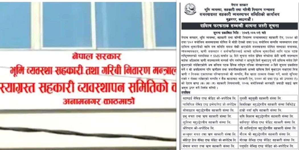 काठमाण्डु – समस्याग्रस्त सहकारी व्यवस्थापन समितिको कार्यालयले १८ सहकारी संस्थाबाट ऋण लिएका ऋणीले ७ दिनभित्र सहकारीबाट लिएको ऋण नतिरे सम्बन्धित व्यक्ति र उसको परिवारलाई कालोसूचीमा राख्ने निर्णय गरेको छ । समितिले बिहिबार सूचना जारी गर्दै ६ दिनभित्र ऋण तिर्न ‘अल्टिमेटम’ दिएको हो ।