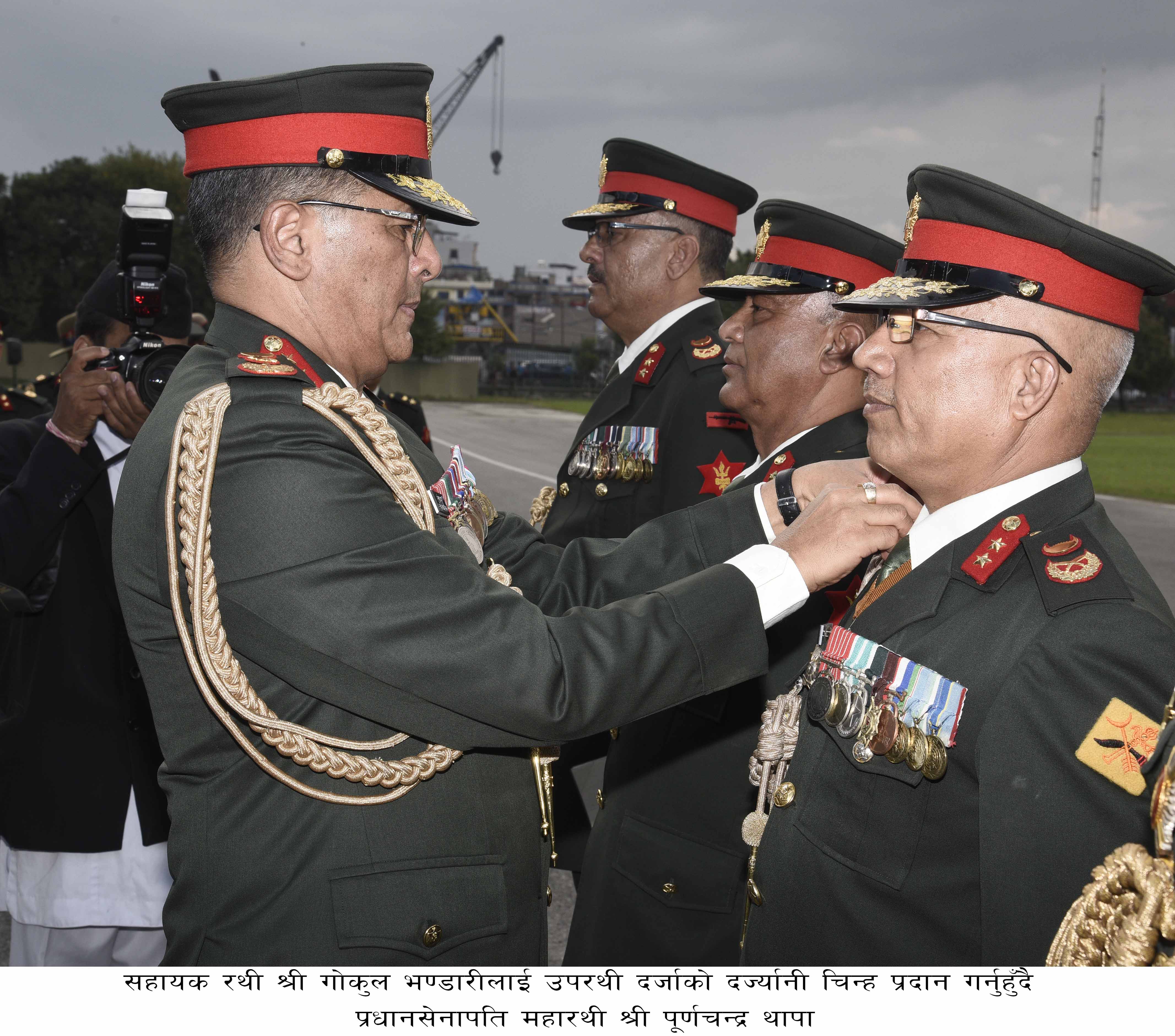 उपरथी दर्जामा पदोन्नति भएका निरिक्षणाधिकृतको कार्यालयका सहायकरथी सिग्देल र पश्चिम पृतना हेडक्वार्टरका सहायकरथी भण्डारीलाई शनिवार सैनिक मञ्च टुंडिखेलमा आयोजित फूलपाती बढाईं समारोह पश्चातको विशेष कार्यक्रममा प्रधानसेनापति पूर्णचन्द्र थापाले उपरथी दर्जाको दज्र्यानी चिन्ह प्रदान गरेका हुन् ।