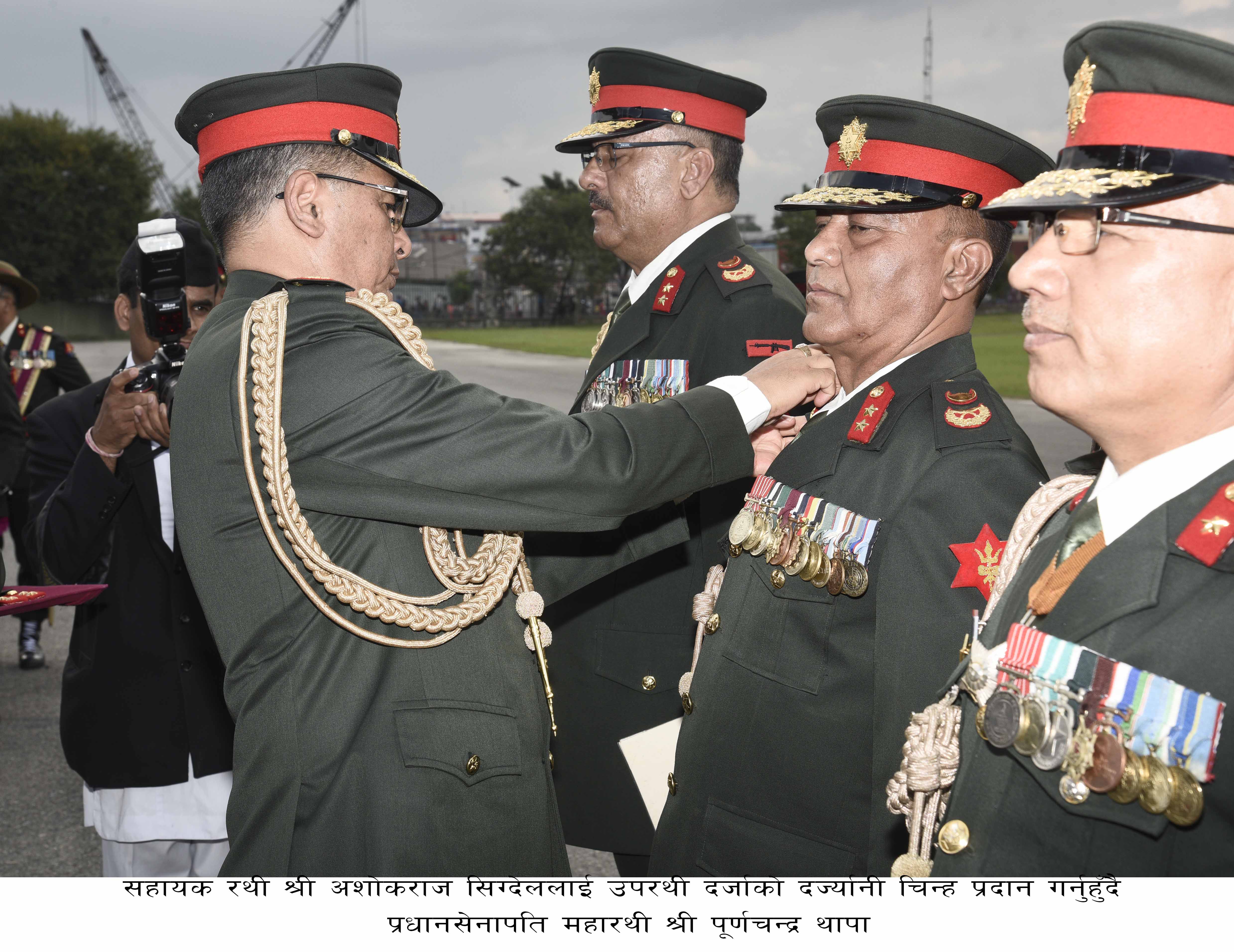 उपरथी दर्जामा पदोन्नति भएका निरिक्षणाधिकृतको कार्यालयका सहायकरथी सिग्देल र पश्चिम पृतना हेडक्वार्टरका सहायकरथी भण्डारीलाई शनिवार सैनिक मञ्च टुंडिखेलमा आयोजित फूलपाती बढाईं समारोह पश्चातको विशेष कार्यक्रममा प्रधानसेनापति पूर्णचन्द्र थापाले उपरथी दर्जाको दज्र्यानी चिन्ह प्रदान गरेका हुन् ।