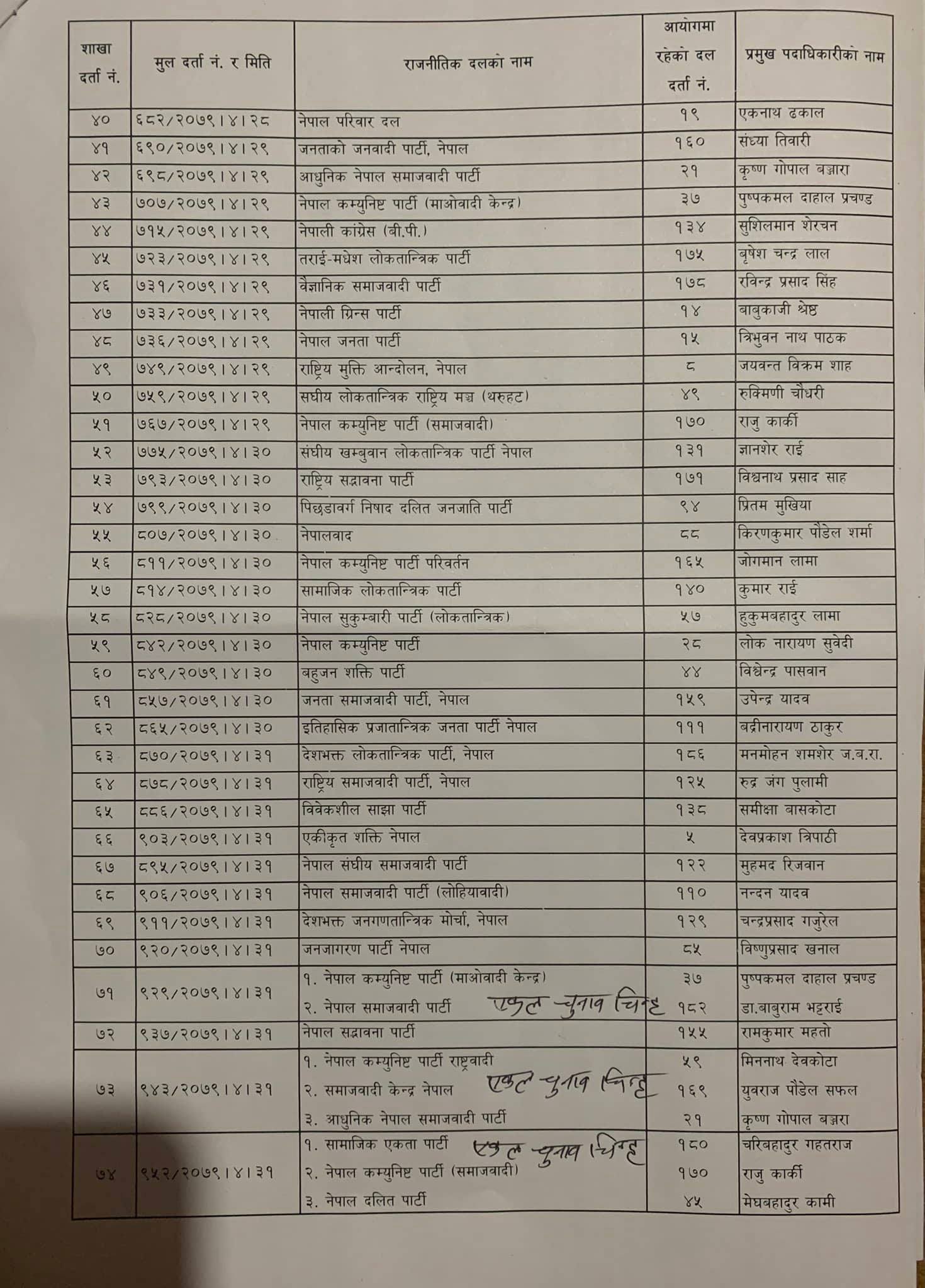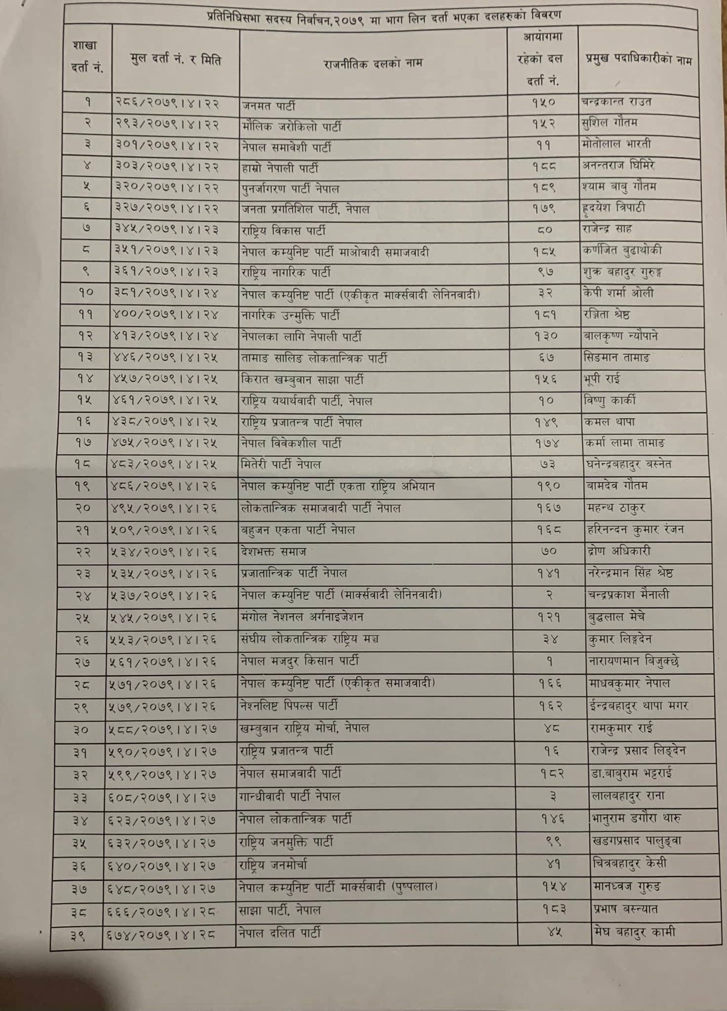 आयोगमा दर्ता भए अनुसार सिके राउत नेतृत्वको जनमत पार्टी एक नम्बरमा दर्ता भएको छ भने रवि लामिछाने नेतृत्वको स्वतन्त्र पार्टी अन्तिममा दर्ता भएको छ ।