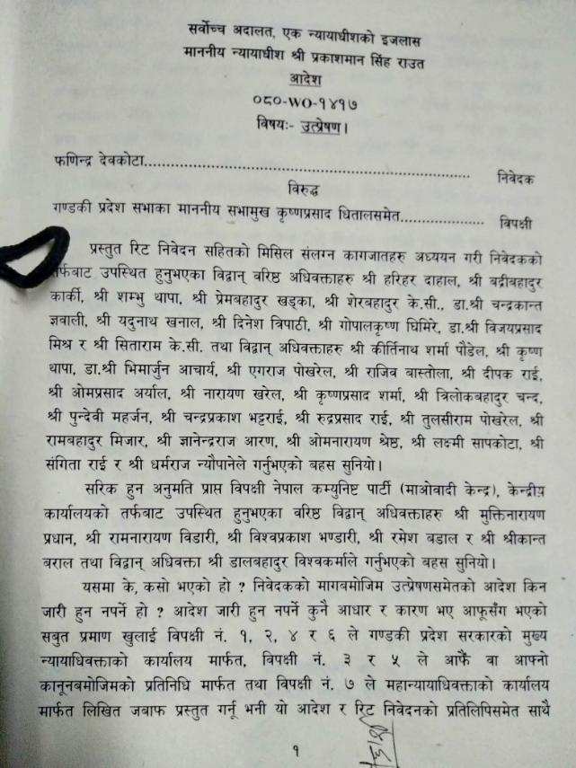 काठमाण्डु- सर्वोच्च अदालतले गण्डकी प्रदेशका निलम्बित सांसद फणीन्द्र देवकोटामाथिको कारबाहीको निर्णय कार्यान्वयन नगर्न आदेश दिएको छ ।