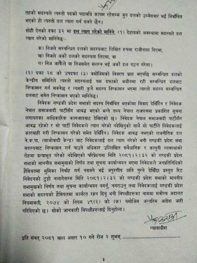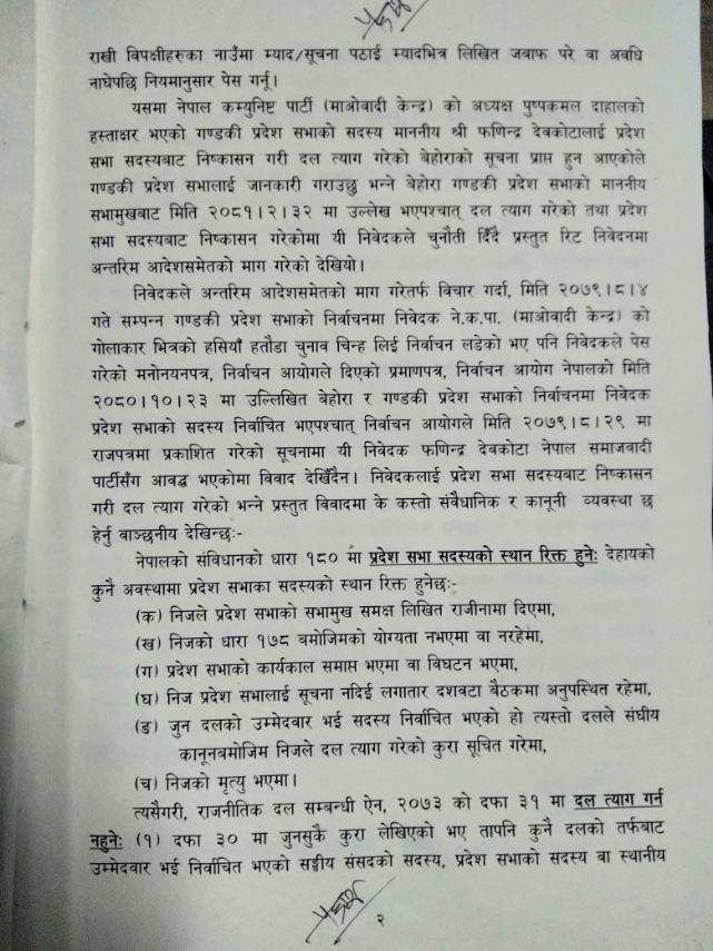 त्यस्तै संविधान र राजनीतिक दलसम्बन्धी व्यवस्था हेर्दा देवकोटाले दल त्याग गरेको नदेखिएको सर्वोच्चको प्रारम्भिक निश्कर्ष छ । गण्डकी प्रदेशका मुख्यमन्त्री सुरेन्द्र पाण्डेलाई विश्वासको मत दिन उनले फ्लोर क्रस गरेका थिए ।