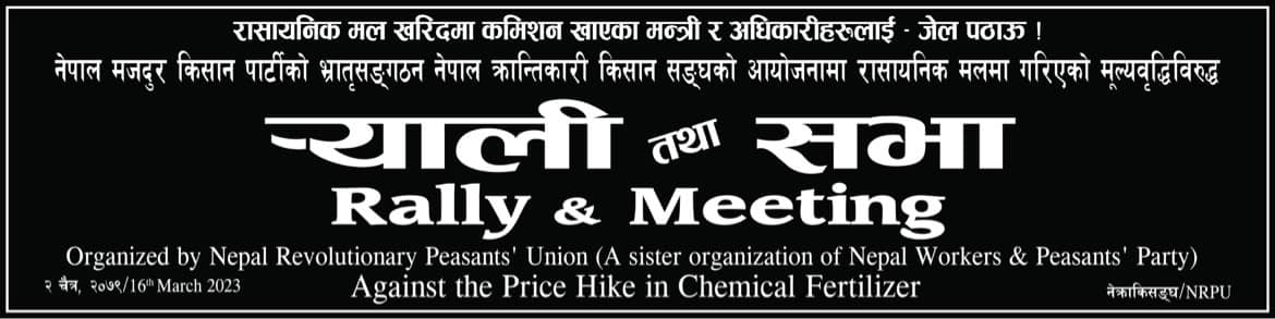 भक्तपुर – नेपाल मजदुर किसान पार्टी (नेमकिपा) निकटको नेपाल क्रान्तिकारी किसान संघले मूल्यवृद्धिविरुद्ध प्रदर्शनमा उत्रिने भएकाे छ ।