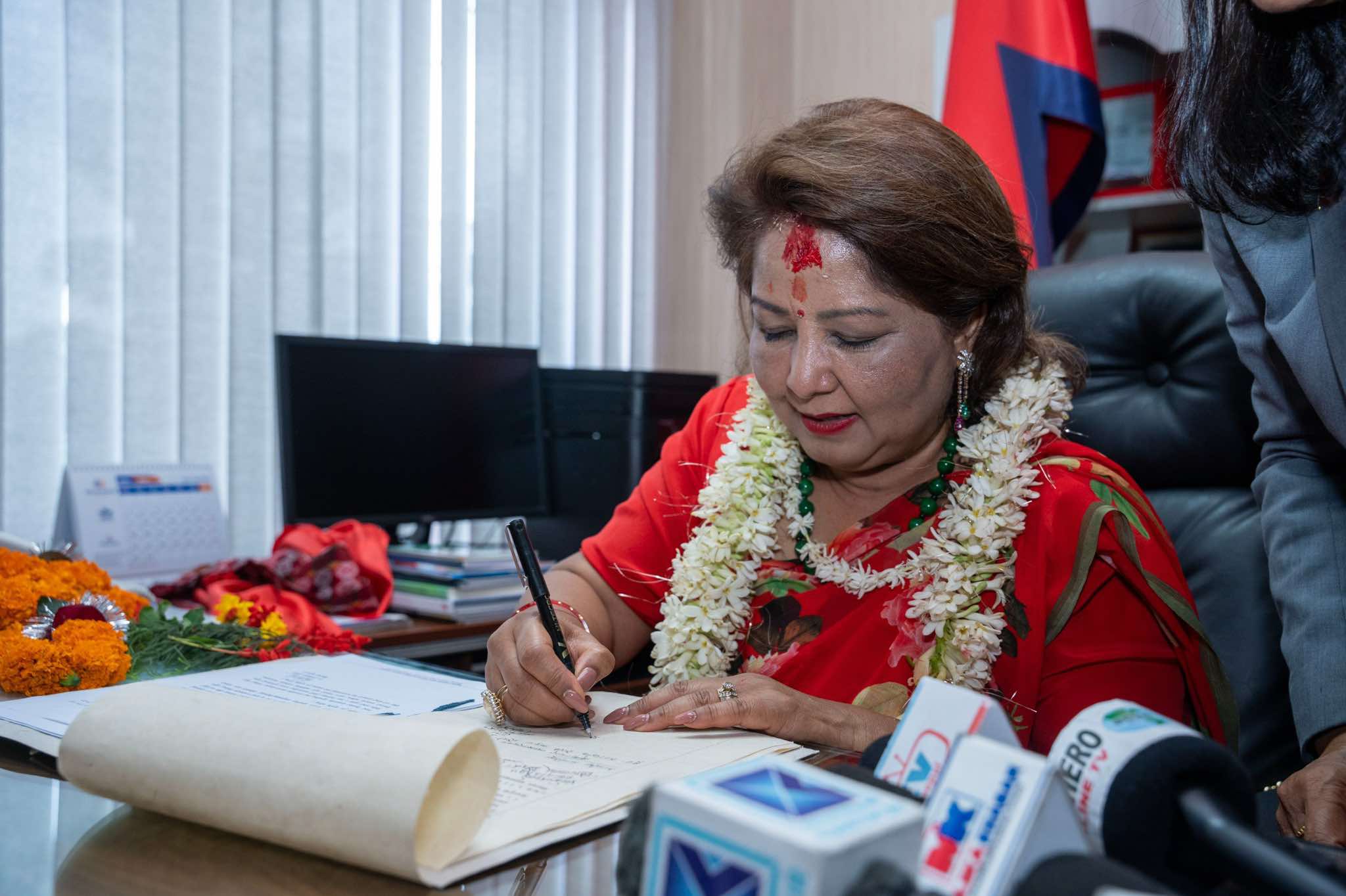 पदबहालीका क्रममा विभिन्न मुलुकका राष्ट्रिय दिवस तथा नेपालसँगका सम्बन्धबारे पठाउनुपर्ने सन्देशलाई व्यवस्थापन गर्ने सम्बन्धी मन्त्रालयको पहिलो निर्णयमा उनले हस्ताक्षर गरिन् ।