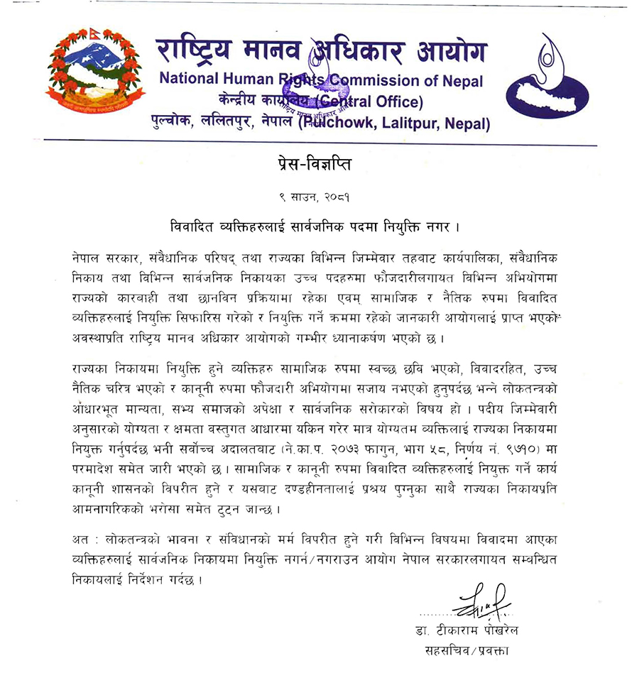 आयोगका प्रवक्ता सहसचिव डा. टीकाराम पोखरेलले बुधबार प्रेस विज्ञप्ति जारी गर्दै भनेका छन्, ‘लोकतन्त्रको भावना र संविधानको मर्म विपरीत हुने गरी विभिन्न विषयमा विवादमा आएका व्यक्तिहरूलाई सार्वजनिक निकायमा नियुक्ति नगर्न/नगराउन आयोग नेपाल सरकार लगायत सम्बन्धित निकायलाई निर्देशन गर्दछ ।’
