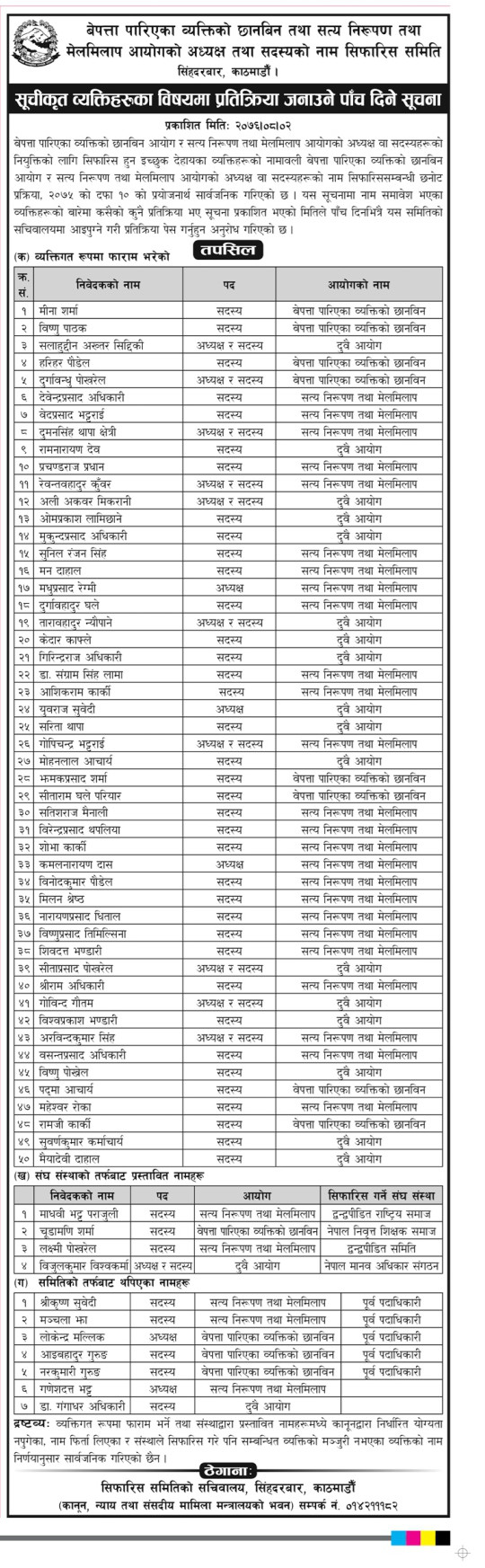 सिफारिस समितिले सत्य निरुपण तथा मेलमिलाप आयोगका पूर्व पदाधिकारी मञ्चला झा र श्रीकृष्ण सुवेदी तथा बेपत्ता छानविन आयोगका लोकेन्द्र मल्लिक, आइबहादुर गुरुङ्ग र नरकुमारी गुरुङ्गको नाम थप गरेको छ । सिफारिस भएका अध्यक्ष तथा सदस्यबारे कुनै प्रतिक्रिया भए पाँच दिनभित्र समितिको सचिवालय सिंहदरबारमा पुग्ने गरी उपलब्ध गराउन पनि समितिले आग्रह गरेको छ । पूर्व प्रधानन्यायाधीश ओमप्रकाश मिश्रको संयोजकत्वमा गएको चैतमा सरकारले दुई आयोगमा पदाधिकारी नियुक्तिका लागि सिफारिस समिति गठन गरेको थियो ।