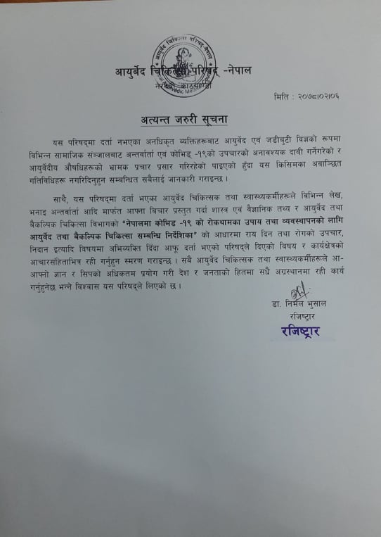 साथै उनले परिषदमा दर्ता भएका आयुर्वेद चिकित्सक तथा स्वास्थ्यकर्मीले मात्र शास्त्र र वैज्ञानिक तथ्यका आधारमा सञ्चार माध्यमलाई आफ्नो राय दिन आग्रह गरेका छन् ।