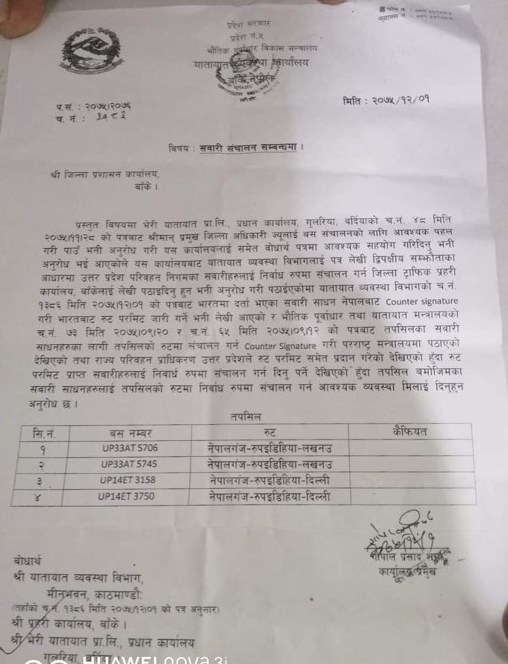 यातायात व्यवस्था कार्यालय नेपालगन्जले भारतीय बस संचालनको लागि कसरी पत्र दियो ? यो बिषयमा यातायात व्यवस्था विभाग काठमाडौका सिनियर इन्जिनियर मोहन भट्टराईले भने-“यातायात विभागले यातायात मन्त्रालयमा काउण्टर हस्ताक्षर गरेर पत्र पठाई सकेका छौं । हाम्रो मन्त्रालयले परराष्ट्रमा पठाउने र परराष्ट्र मन्त्रालयले दिल्ली स्थित नेपाली राजदुताबासमा जानकारी गराउनु पर्छ । अनि हामी जस्तै भारतको विभागले नेपाली राजदुताबाससंग समन्वय गरी अनुमति दिनु पर्छ । तर नेपाली राजदुताबाससंग समन्वय गरेको देखिएको छैन । नेपालगन्जको कार्यालयले संचालनको लागि कसरी पत्र दियो रु अब आइतबार मात्रै खोजीनीति हुन्छ ।”