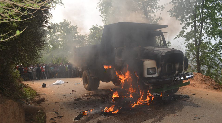 दुर्घटनापश्चात आक्रोशित स्थानीयवासीले ठक्कर दिने बा५ख २८९८ नंको टिपरमा आगजनी गरेर क्षति पु¥याइदिएका छन् ।