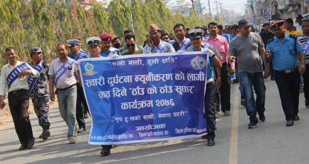 भरतपुर – जिल्ला ट्राफिक प्रहरी कार्यालय चितवनले दुर्घटना न्यूनीकरणका लागि सडक सुरक्षा सप्ताह–२०७६ कार्यक्रम सञ्चालन गर्ने भएको छ । यही वैशाख २३ गतेदेखि २७ गतेसम्म सप्ताहव्यापीरूपमा कार्यक्रम गर्न लागिएको ट्राफिक प्रहरी प्रमुख चन्द्र गिरीले जानकारी दिए ।