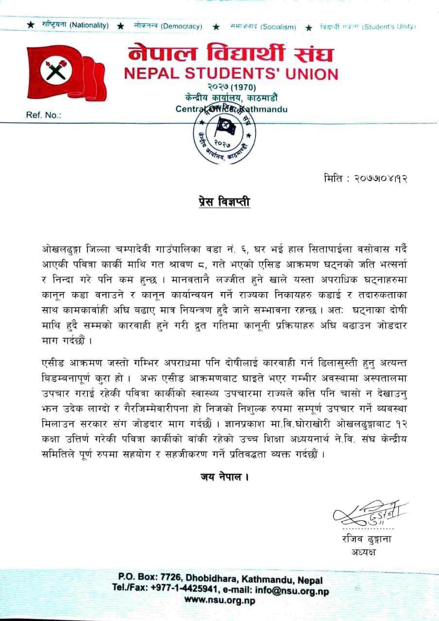 काठमाण्डु – नेपाल विद्यार्थी संघ (नेविसंघ)ले एसिड आक्रमणका दोषीलाई हदैसम्मको कारबाही गर्न माग गरेको छ ।