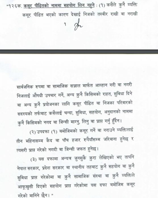 दफा १२६ को खण्ड (क) मा कसूर पीडितको नामाा सहयोग लिन नहुने व्यवस्था गरिएको छ । उक्त दफाको उपदफा (१) अनुसार कसैले कुनै व्यक्ति कसूर पीडित भएको कारण देखाई निजको तस्बीर राखी वा नराखी सार्वजनिक रुपमा वा सामाजिक सञ्जालमार्फत आह्वान गरी वा नगरी निजलाई औषधी उपचार गर्ने, अन्य कुनै किसिमको राहत, सुविधा दिने वा अन्य कुनै प्रयोजनका लागि कसूर पीडित वा निजका परिवारको सदस्यको तर्फबाट कसैलाई चन्दा, सुविधा , सहयोग, अनुदानको नाममा कुनै पनि नगद वा जिन्सी माग्नु, लिन वा प्राप्त गर्न पाइने छैन् ।