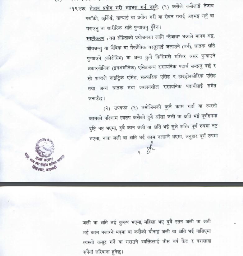 काठमाण्डु – सरकारले तेजाब पीडितका लागि फौजदारी कसुर तथा फौजदारी कार्यविधिसम्बन्धी केही ऐन संशोधन गर्न बनेको अध्यादेशमार्फत नयाँ कानून ल्याएको छ ।