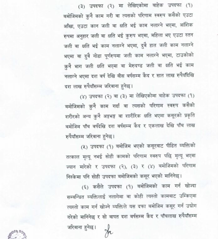 त्यस्तै कुनै काम गर्दा वा त्यसको परिणामस्वरुप कसैको शरीरको अन्य अंगभंग वा शारीरिक क्षति भएमा कसूरको प्रकृति अनुसार पाँचदेखि १० वर्षकैद र एक लाखदेखि पाँच लाखसम्म जरिवानाको व्यवस्था गरिएको छ ।