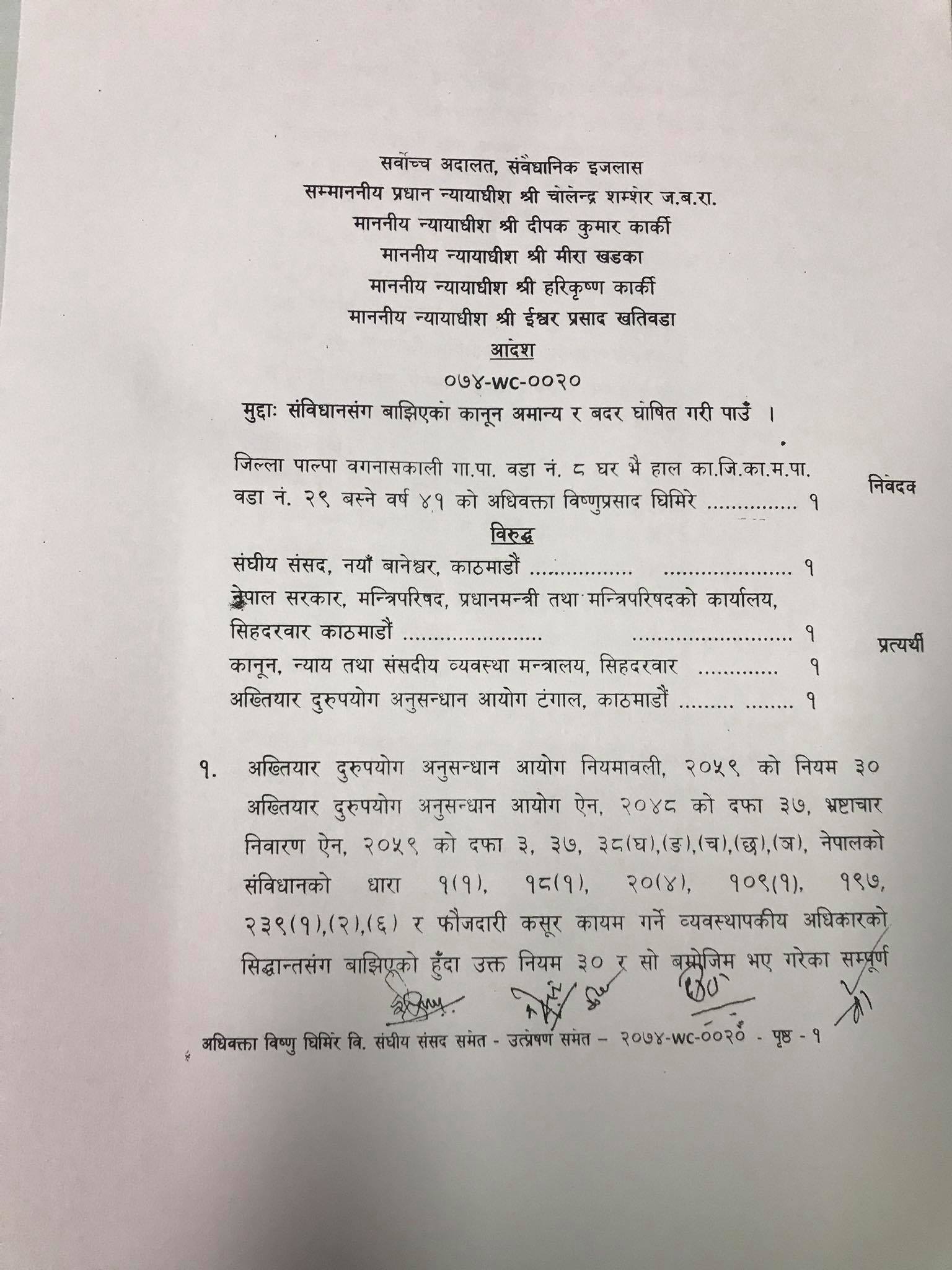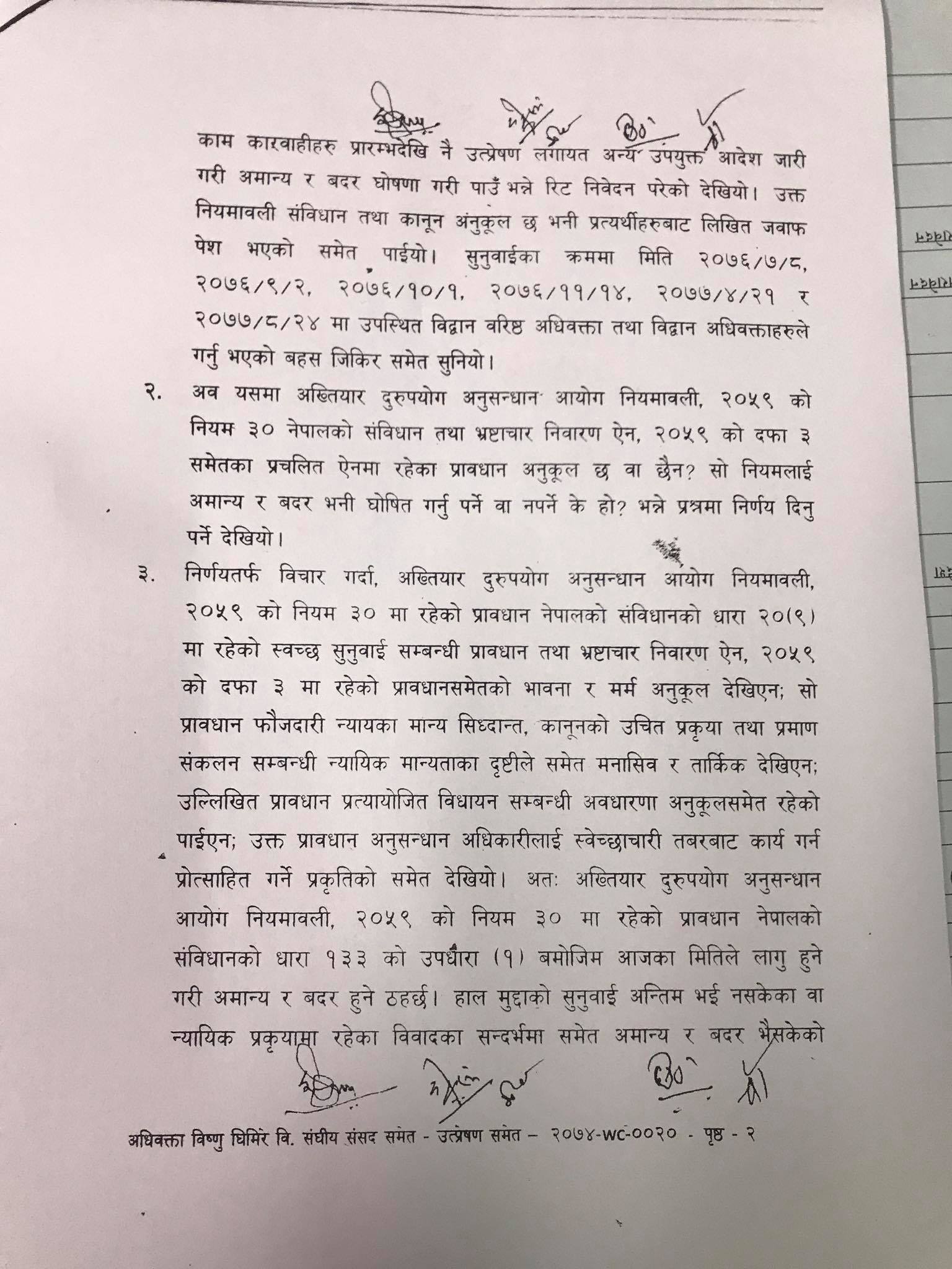 अधिवक्ता विष्णुप्रसाद घिमिरेले दिएको निवेदनमा अख्तियारको स्टिङ अपरेसन खारेज गर्न माग गरिएको थियो ।