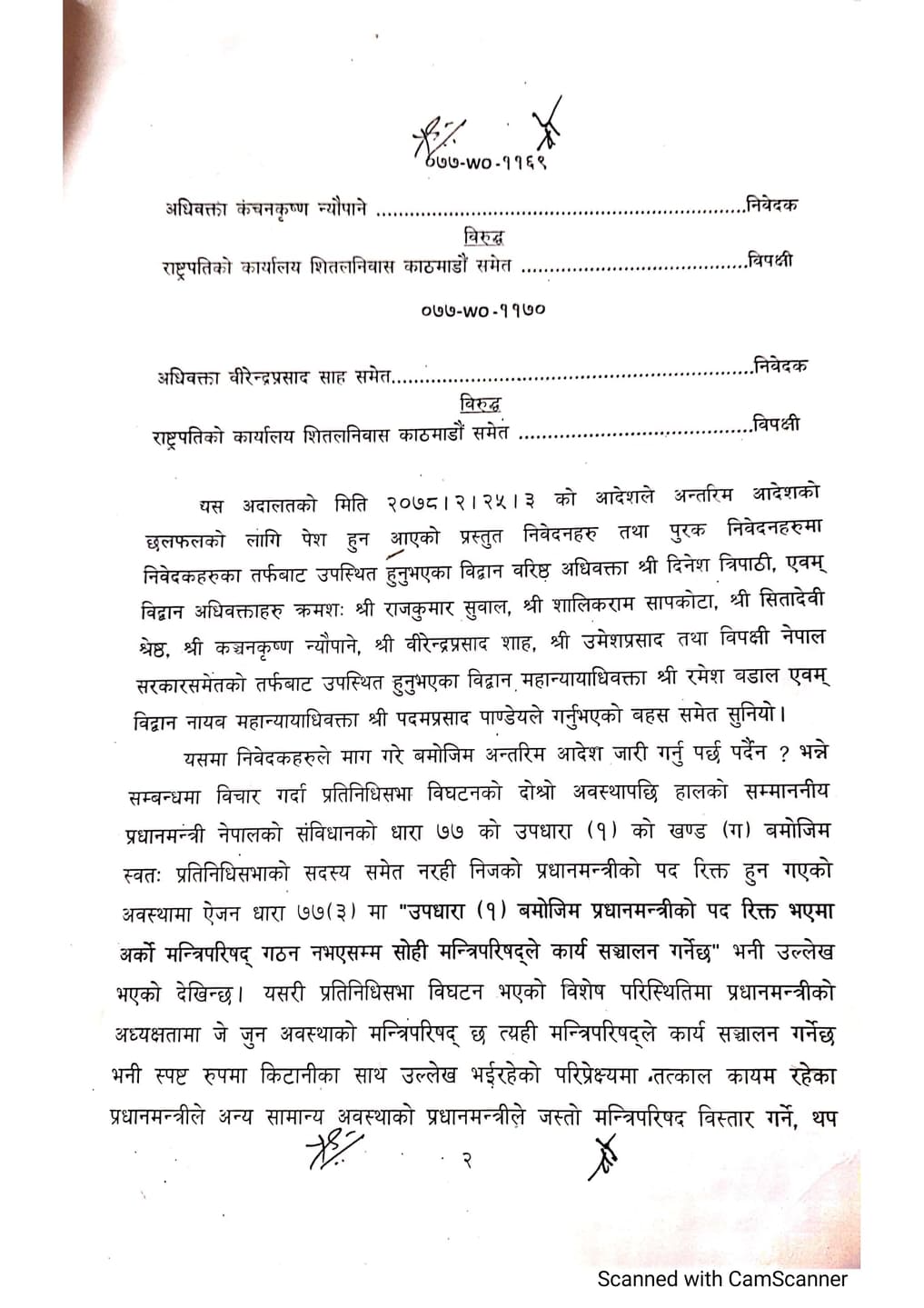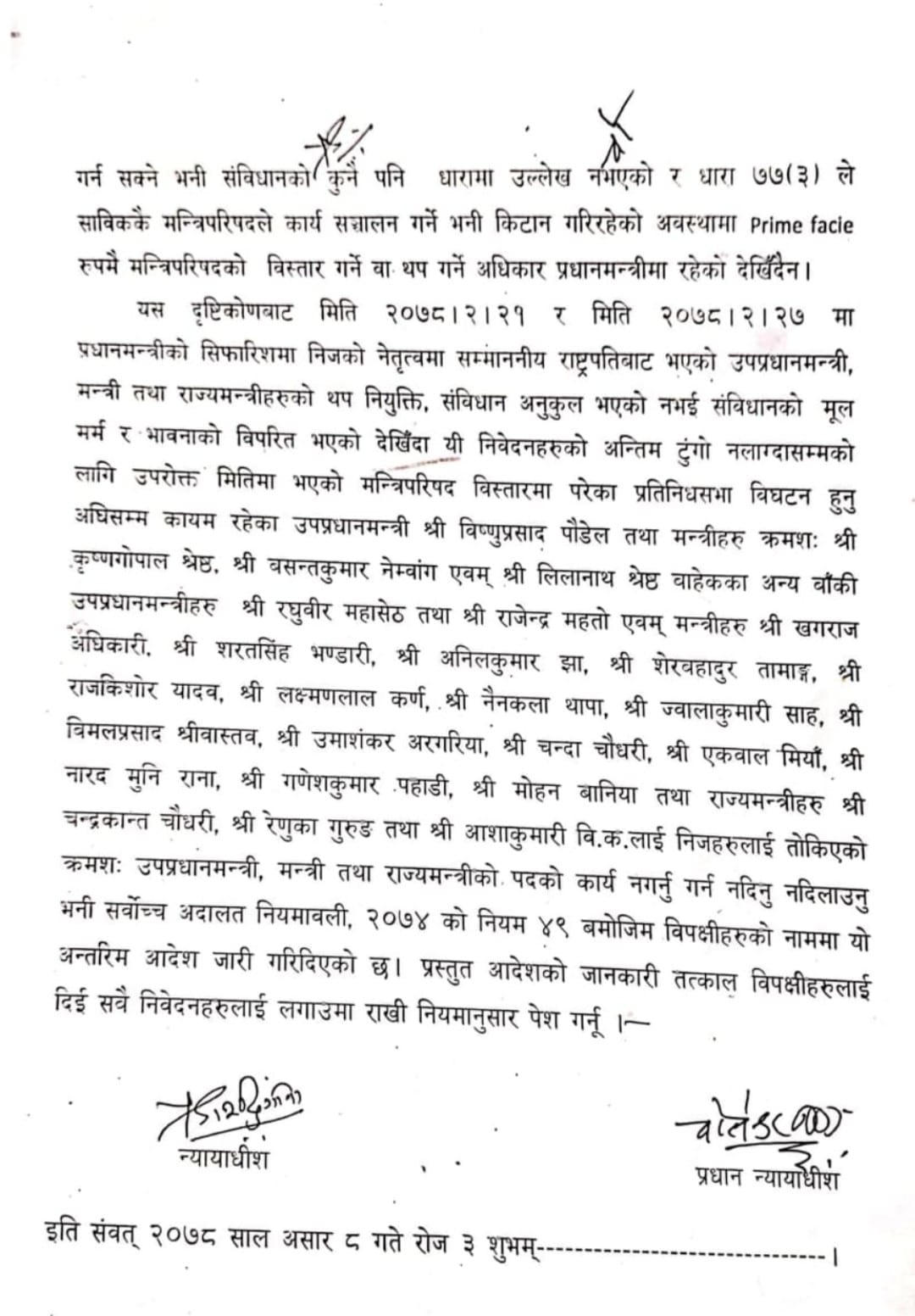 प्रधानन्यायाधीश चोलेन्द्र समसेर जबरा र न्यायाधीश प्रकाश ढुंगानाको इजलासले नवनियुक्त मन्त्रीहरुलाई काम कारबाही गर्न नदिन अन्तरिम आदेश जारी गरेको हो ।