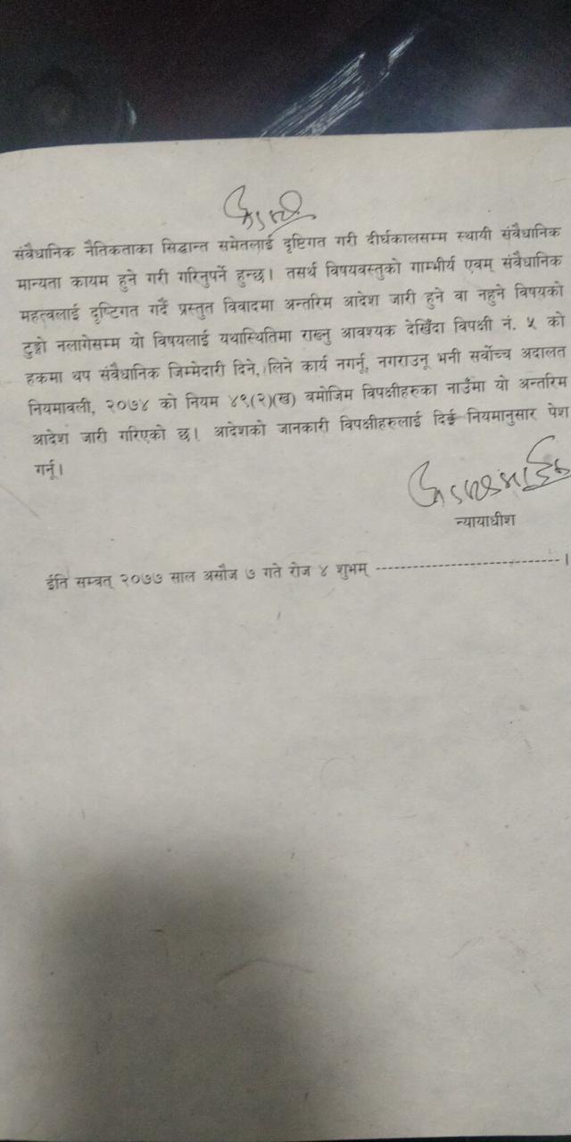न्यायाधीश डा. आनन्दमोहन भट्टराईको इजलासले उपाध्यक्ष गौतमलाई मुद्दाको अन्तिम किनारा नलागेसम्म कुनै पनि जिम्मेवारी नदिन आदेश दिएको हो ।