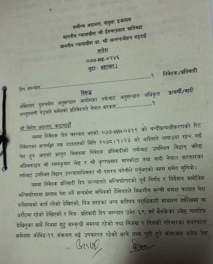 साथै उनी र उनको परिवारमा कोरोना संक्रमण पुष्टि भएको अवस्थामा मानवीय दृष्टिले अनुचित हुने भएकाले रिहा गर्न आदेश दिएको हो । उनी हाल डिल्लीबजार कारागारमा थुनामा छन् ।