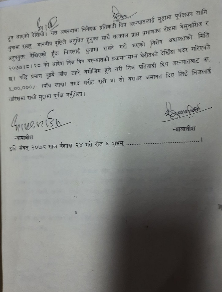 शुक्रबार अदालतका न्यायाधीश ईश्वरप्रसाद खतिवडा र आनन्दमोहन भट्टराईको संयुक्त इजलासले बस्न्यातमा मुटुको समस्या रहेकाले ५ लाख धरौटीमा रिहा गर्न आदेश दिएको हो ।