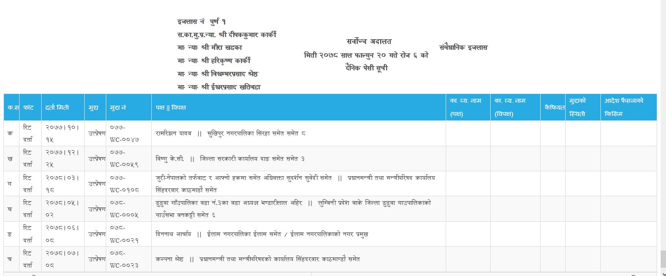 कामु प्रधानन्यायाधीश कार्कीले नेतृत्व गर्नेगरी ६ महिनापछि सुचारु भएको संवैधानिक इजलासको पहिलो पेशीमा सामान्य प्रकृतिका मुद्दा मात्रै समावेश गरिएको छ । यस पटकको संवैधानिक इजलासमा सुखीपुर नगरपालिका सिरहा, जिल्ला सरकारी वकिल कार्यालय दाङ, प्रधानमन्त्री तथा मन्त्रीपरिषद्को कार्यालय लगायतको सामान्य प्रकृतिको ६ थान मुद्दा मात्रै पेसीमा राखिएको छ ।