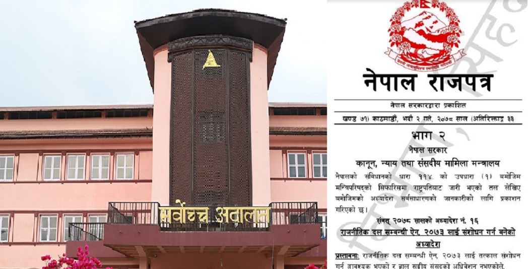 काठमाण्डु – राजनीतिक दल विभाजन सम्बन्धी अध्यादेशविरुद्ध दायर भएको रिटको सुनुवाई संवैधानिक इजलासमा हुने भएको छ ।