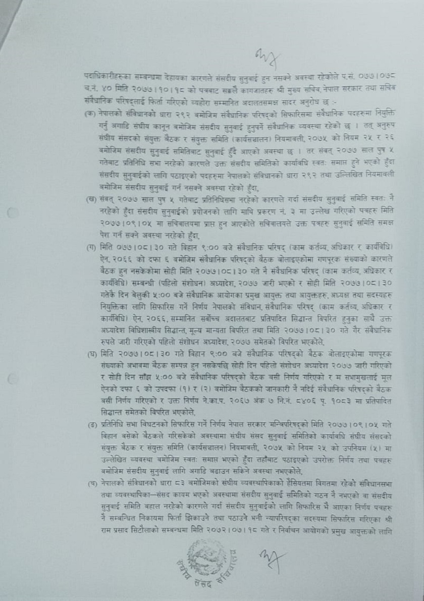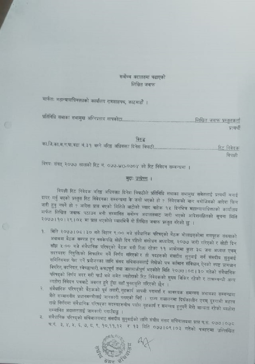 वरिष्ठ अधिवक्ता डा. दिनेश त्रिपाठीले सभामुख सापकोटा समेतलाई विपक्षी बनाइ सर्वोच्च अदालतमा दायर गरेको रिटमा प्रारम्भिक सुनुवाई गर्दै इजलासले विपक्षीका नाममा लिखित जवाफ पेस गर्न आदेश दिएको थियो ।