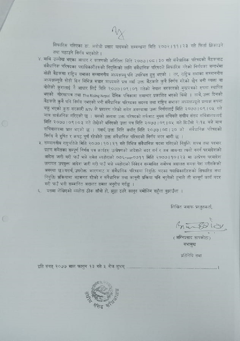 उनले मंसिर ३० गते आफूलाई बैठकबारे जानकारी नै नदिई संवेधानिक परिषद्को बैठक बसेर निर्णय गरेको बताएका छन् । उनले मंसिर ३० गतेको बैठकका निर्णय भन्दै पुस ५ मा मात्र विवरण सार्वजनिक भएको तथा परिषदको तर्फबाट पुस ३ गते लेखिएको पत्र संसद सचिवालयलाई पुस ५ गते दिउँसो २ः१५ मा मात्र प्राप्त भएको बताएका छन् ।