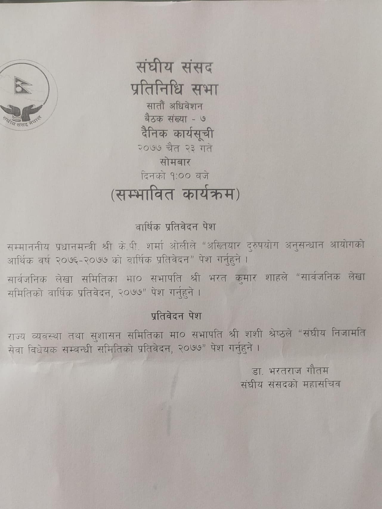 यसैगरी सार्वजनिक लेखा समितिका सभापति भरतकुमार शाहले सार्वजनिक लेखा समितिको वार्षिक प्रतिवेदन २०७७ पेश गर्ने, राज्यव्यवस्था तथा सुशासन समितिका सभापति शशी श्रेष्ठले संघीय निजामति सेवा विधेयकसम्बन्धी समितिको प्रतिवेदन २०७७ पेश गर्ने कार्यसूची रहेको छ ।