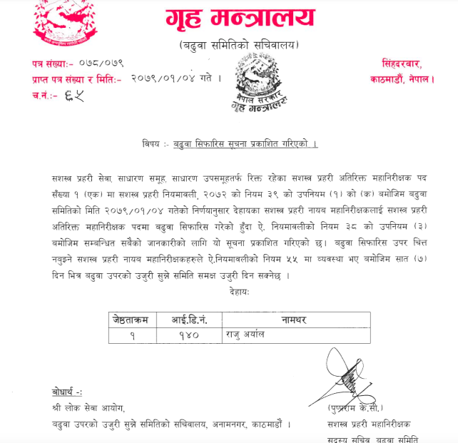 अहिले एआईजीमा बढुवा हुने डीआईजी नै बैशाख १९ पछी सशस्त्र प्रहरीको ४ वर्षे महानिरीक्षक हुने लगभग निश्चित छ । यससंगै डीआईजी अर्याल केसीपछी आईजीपी बन्ने बाटो खुलेको हो ।