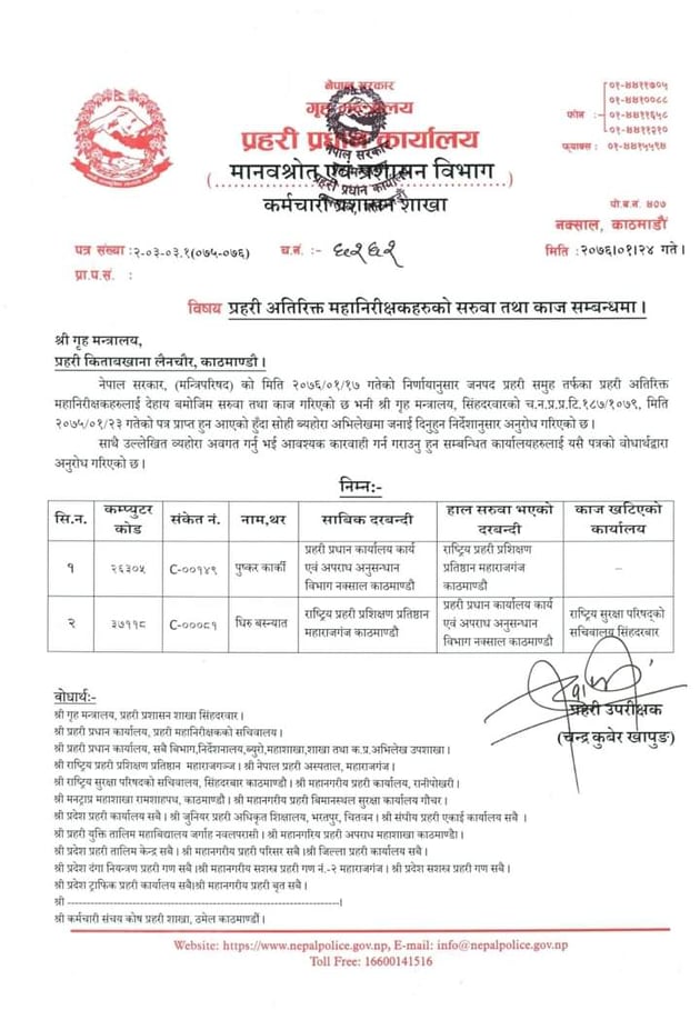 पुष्कर कार्कीलाई प्रहरी एकेडेमी सरुवा गरिएको छ भने धिरु बस्न्यातलाई राष्ट्रिय सुरक्षा परिषद्को सचिवालय सिंहदरबारमा काज सरुवा गरिएको छ । त्यस्तै सोमबार नेपाल प्रहरीका ८ जना एसएसपीहरुको सरुवा भएको छ ।
