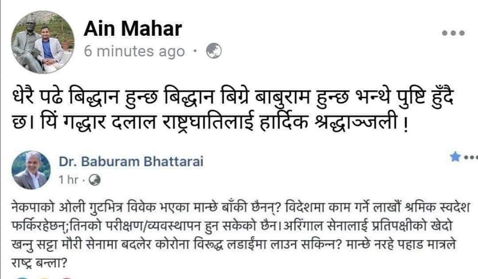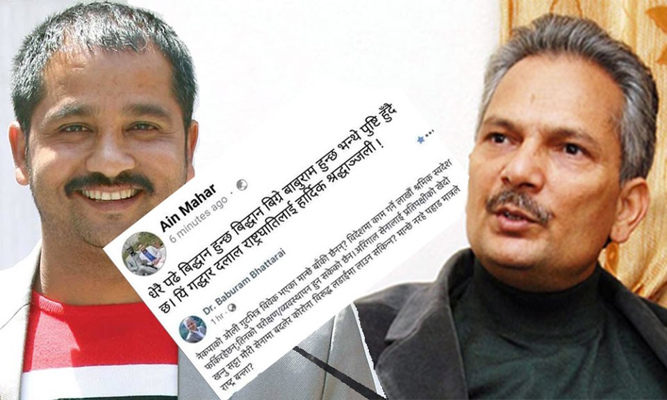 पटक पटक सामाजिक सञ्जाल र अन्य औपचारिक कार्यक्रममा समेत विपक्षीप्रति तल्लोस्तरको भाषाशैलीका साथ आलोचनामा उत्रिने उनले पूर्वप्रधानमन्त्री डा. भट्टराईलाई श्रद्धाञ्जली दिएका छन् । उनले आफ्नो सामाजिक सञ्जाल फेसबुकमा भट्टराईको आलोचना गर्दै श्रद्धाञ्जली दिएका हुन् । ‘धेरै पढे विद्धान हुन्छ, विद्धान बिग्रे बाबुराम हुन्छ भन्थे पुष्टि हुँदैछ। यी गद्दार दलाल राष्ट्रघातीलाई हार्दिक श्रद्धाञ्जली !’ उनले फेसबुकमा लेखेका छन् ।