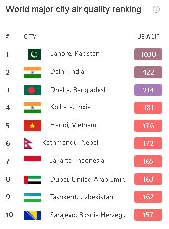 पाकिस्तानको लाहोर विश्वकै प्रदूषित सहरको शीर्ष स्थानमा कायम छ । त्यहाँको एक्यूआई ७०८ रहेको छ । यो निकै खतरनाक मानिन्छ ।