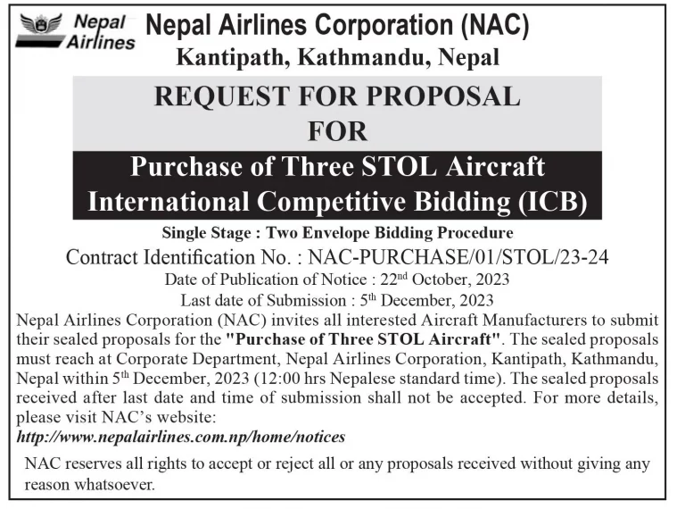 दुर्गम क्षेत्रमा उडानका लागि तीन जहाज खरिदका लागि बोलपत्र आह्वान गरिएको निगमले जनाएको छ ।