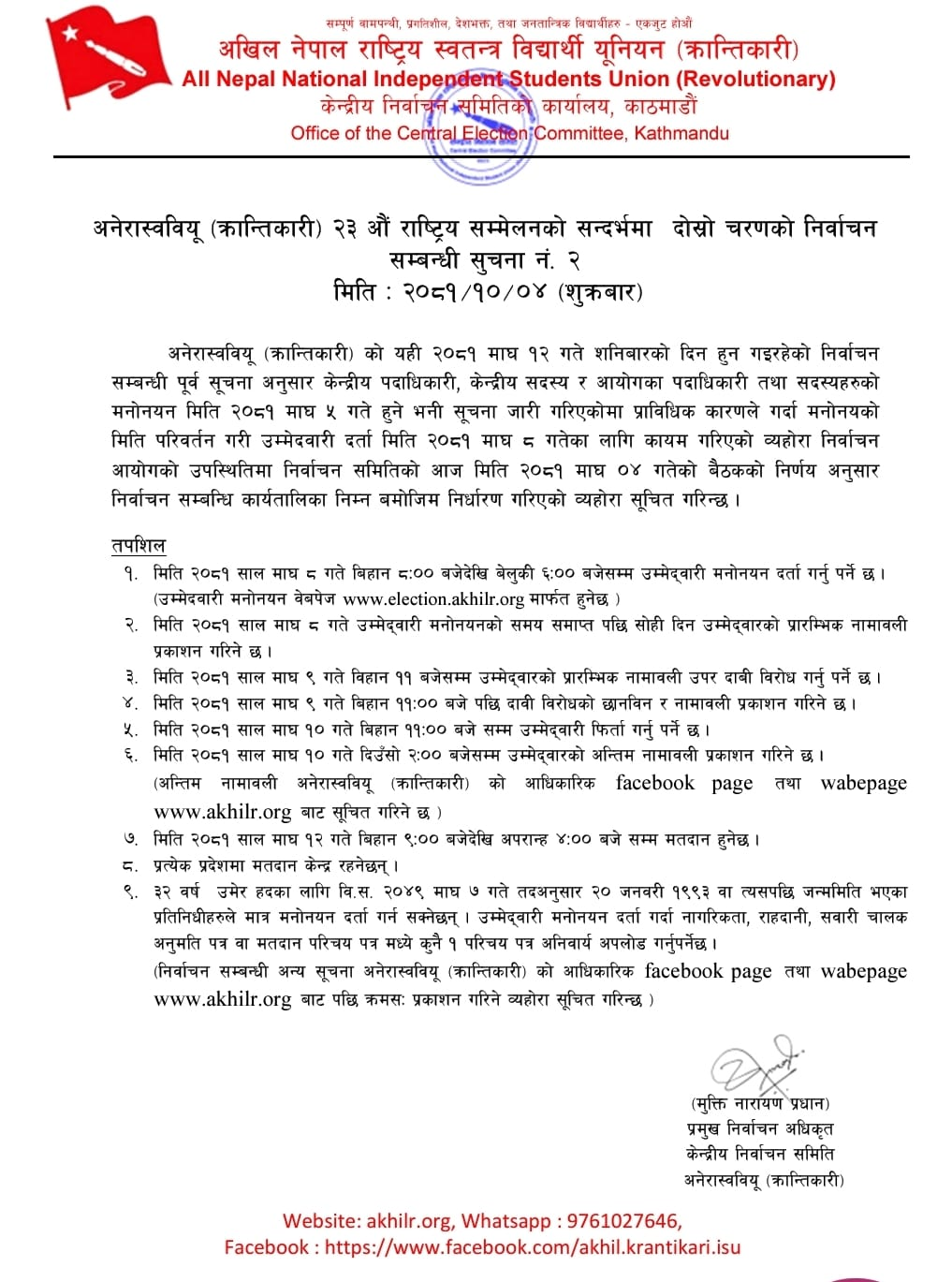 प्रमुख निर्वाचन अधिकृत मुक्ति नारायण प्रधानले एक सूचना जारी गर्दै केन्द्रीय पदाधिकारी, केन्द्रीय सदस्य र आयोगका पदाधिकारी तथा सदस्यहरुको मनोनयन माघ ५ गते हुने भनी सूचना जारी गरिएकोमा प्राविधिक कारणले गर्दा मनोनयको मिति परिवर्तन गरी माघ ८ गते कायम गरिएको जानकारी दिएका छन् ।