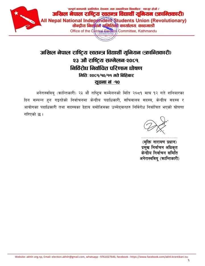 अनेरास्ववियू (क्रान्तिकारी)को विभिन्न पदका केही उम्मेदवार निर्विरोध निर्वाचित भएका छन् ।