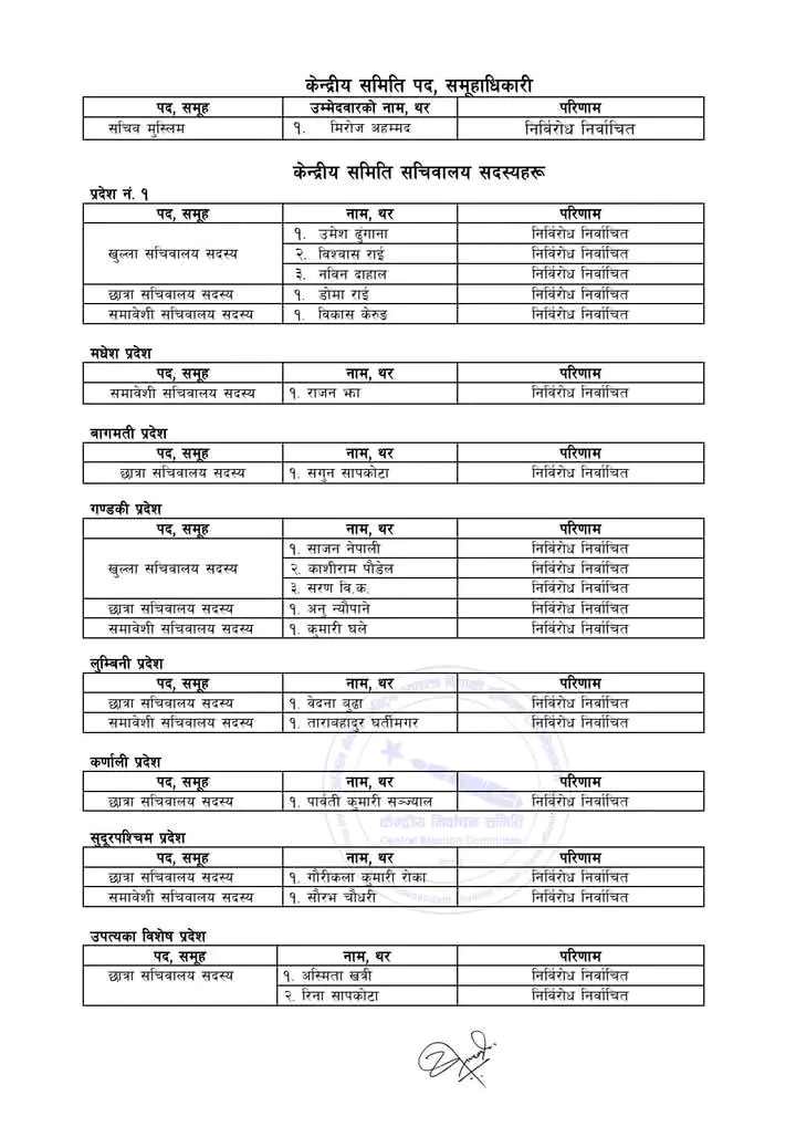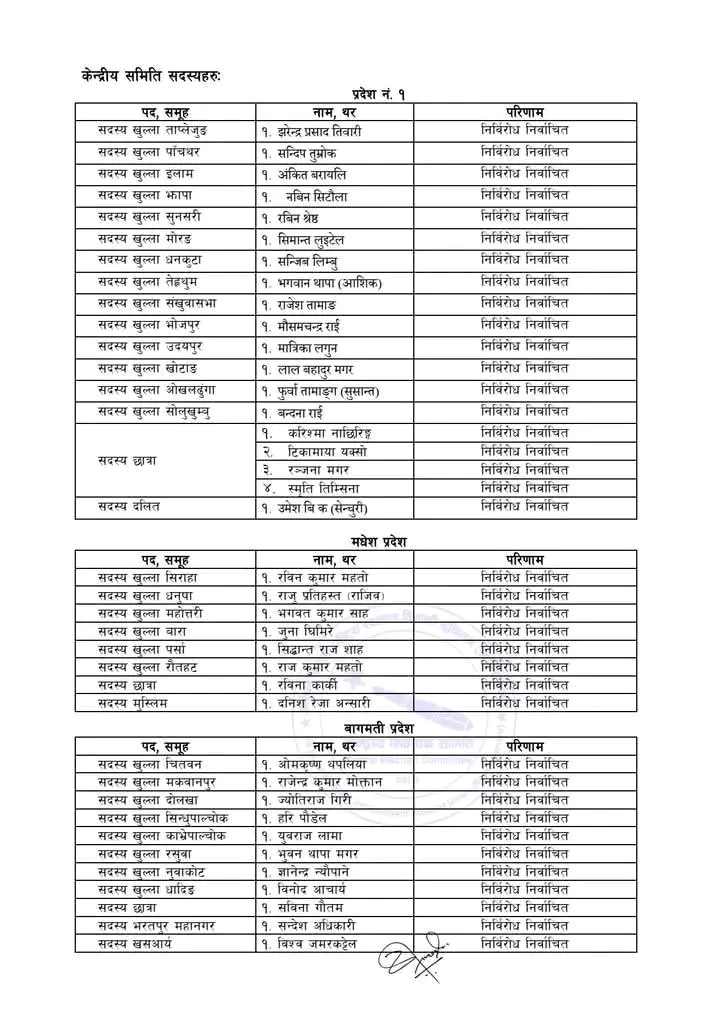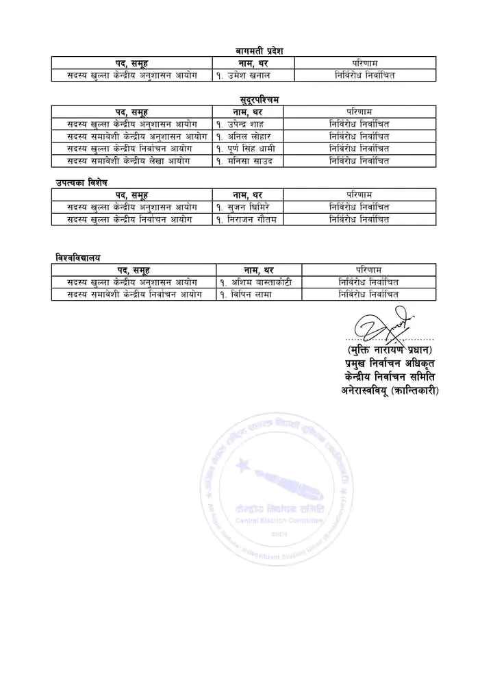 निर्वाचन समितिकाअनुसार केन्द्रीय पदाधिकारी, सचिवालय सदस्य, केन्द्रीय सदस्य र आयोगका पदाधिकारी तथा सदस्यमा केही उम्मेदवार निर्विरोध भएका हुन् ।