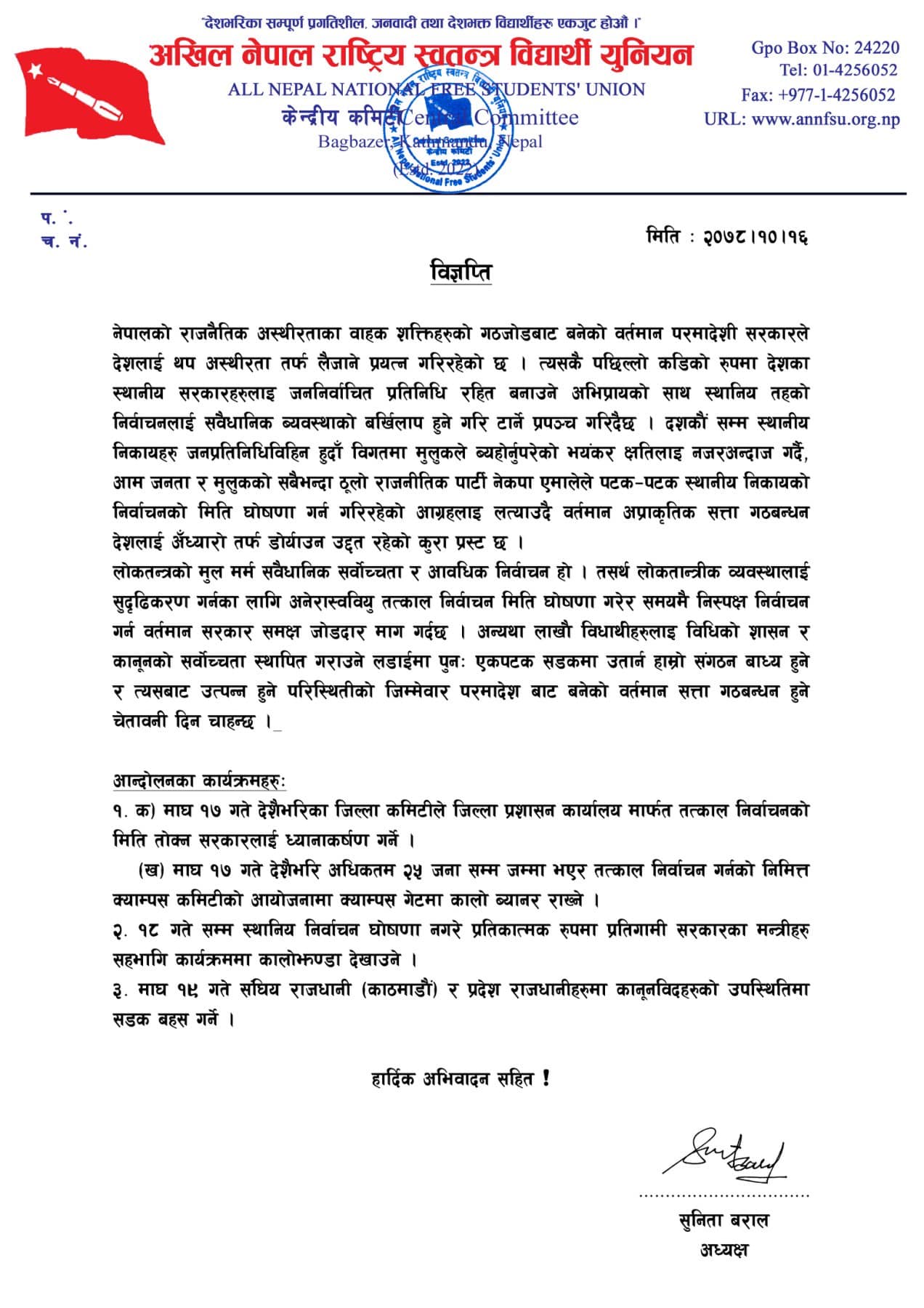 माघ १८ गतेसम्म निर्वाचन घोषणा नगरे प्रतिकात्मक रूपमा सरकारका मन्त्रीहरू सहभागी कार्यक्रममा कालो झण्डा देखाइने विज्ञप्तिमा भनिएको छ । अनेरास्ववियुले माघ १९ गते काठमाण्डु र प्रदेश राजधानीहरूमा कानूनविद्हरूसँग सडक बहस गर्ने बताएको छ ।
