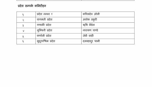 जसअनुसार प्रदेश १ सम्पर्क कमिटीको अध्यक्षमा कपिलदेव ओली चयन भएका छन् । बागमतीमा अशोक ठकुरी, गण्डकीमा ऋषि कँडेल र लुम्बिनी प्रदेश सम्पर्क कमिटीको अध्यक्षमा नारायण पाण्डे चुनिएका छन् ।