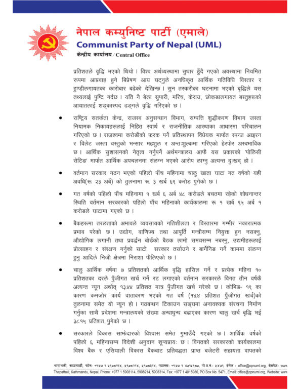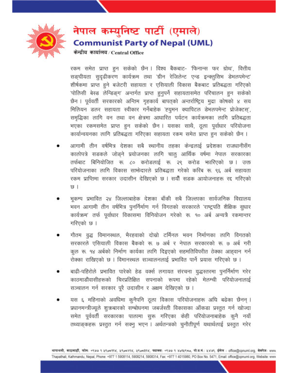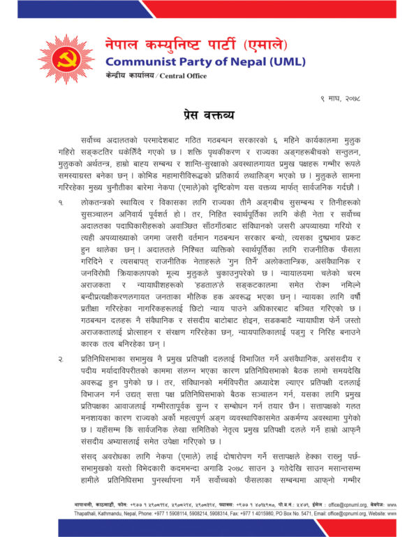आइतबार एमाले अध्यक्ष केपी शर्मा ओलीले ८ पृष्ठे लामो वक्तव्य जारी गर्दै सर्वोच्च अदालतको परमादेशबाट बनेको गठबन्धन सरकार सबै पक्षमा असफल भएको बताएका हुन् ।