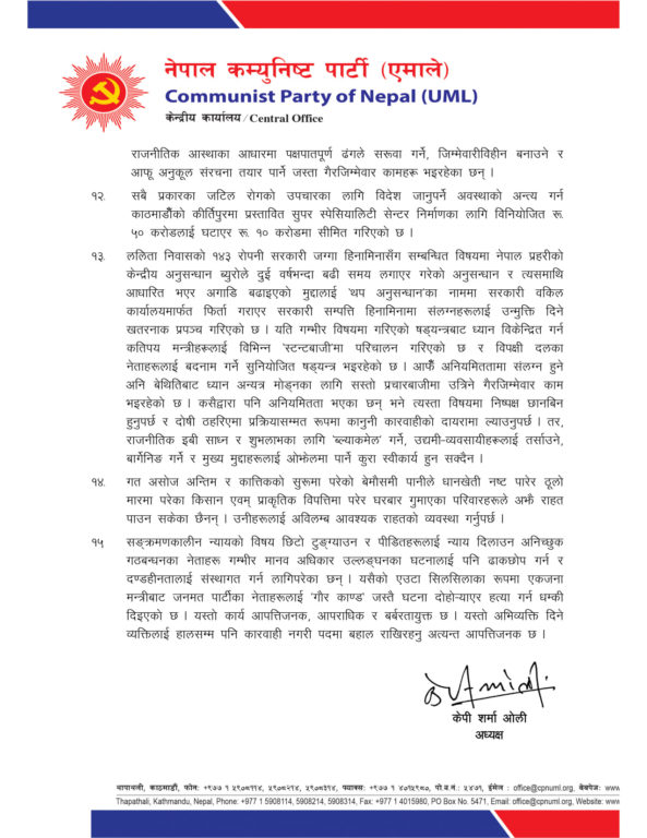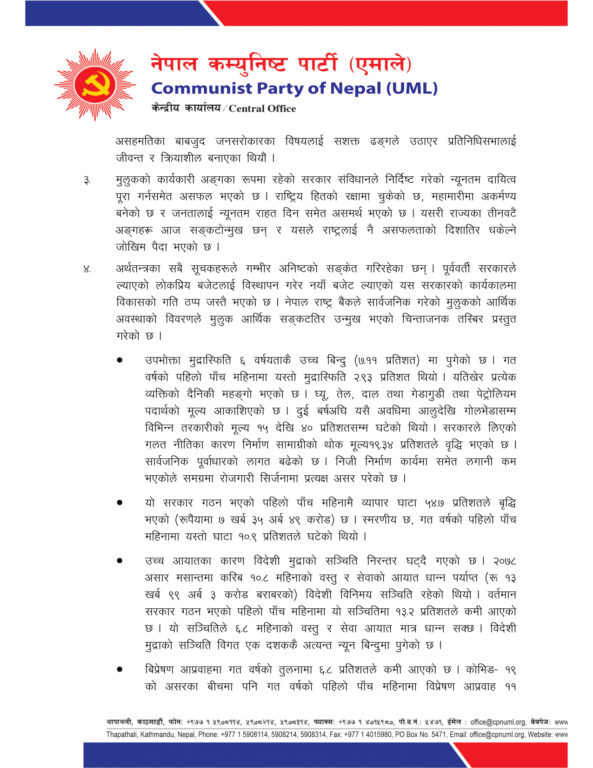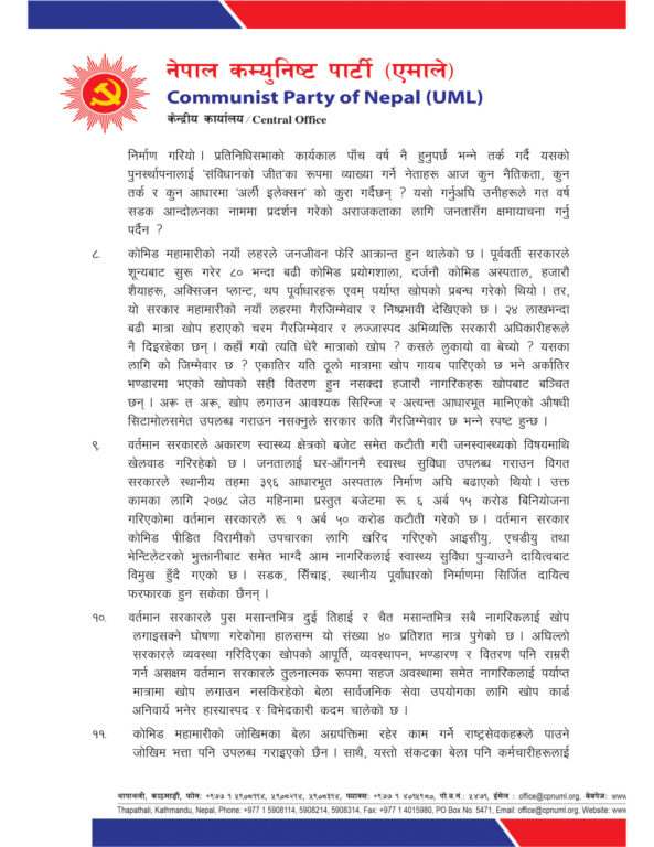 साथै अध्यक्ष ओलीले कोरोना महामारी रोकथाम तथा नियन्त्रणमा सरकारले चासो नदएिको आरोप लगाएका छन् ।