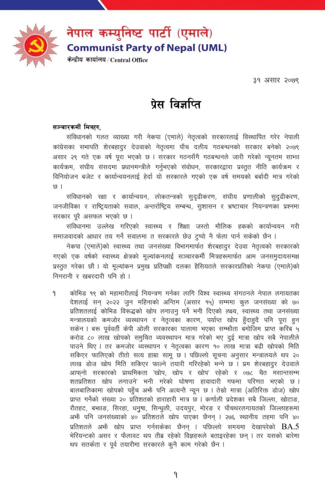 ‘कमजोर व्यस्थापन र नेतृत्वका कारण १० लाख मात्रा बढी खोपको मिति सकिएर फालिएको तीतो सत्य हाम्रासामु छ । पछिल्लो सूचनाअनुसार मन्त्रालयले थप २० लाख डोज खोप मिति सकिएर फाल्ने तयारी गरिरहेको भन्ने छ । प्रम शेरबहादुर देउवाले आफ्नो सरकारको प्राथमिकता ‘खोप, खोप र खोप’ रहेको र ०७८ चैत मसान्तसम्म शतप्रतिशत खोप लगाउने’ भनी गरेको घोषणा हावादारी गफमा परिणत भएको छ,’ विज्ञप्तिमा भनिएको छ, ‘बालबालिकामा खोपको पहुँच अझै पनि अत्यन्तै न्यून छ । तेस्रो मात्रा (अतिरिक्त डोज) खोप प्राप्त गर्नेको संख्या २० प्रतिशतको हाराहारी मात्र छ । कर्णाली प्रदेशका सबै जिल्ला, खोटाङ, रौतहट, बझाङ, सिरहा, धनुुषा, सिन्धुली, उदयपुर, मोरङ र पाँचथरलगायतको जिल्लाहरुमा अझै पनि जनसंख्याको ४० प्रतिशतले खोप पाएका छैनन् ।’